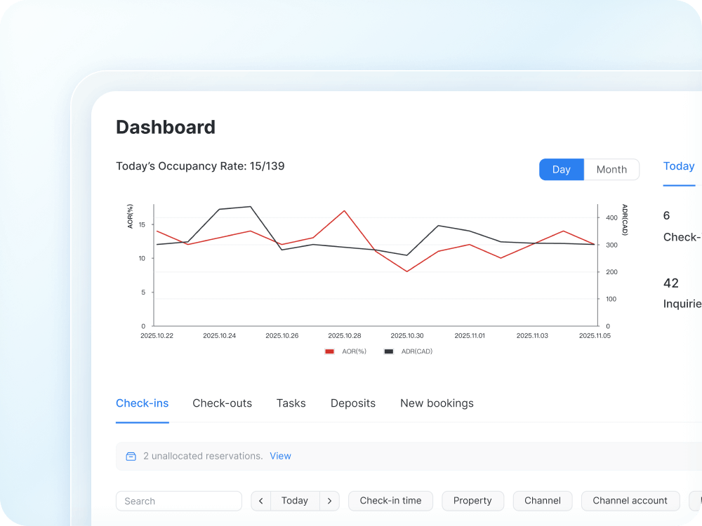 Handle everything across Airbnb, Vrbo, Booking.com, and other channels from a single dashboard. Control your listings, pricing, availability, guests, messages, tasks, and reviews without switching platforms.